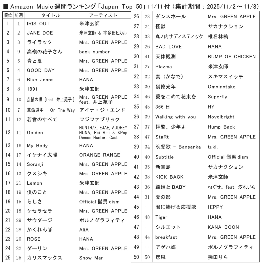 株式会社ガイエ:①パブリシスト(オンライン/オフライン:テレビ・紙パブリシスト募集!)②SNSプランナー③宣伝プロデューサー Amazon Musicは11日、Amazon Musicで最も再生された楽曲を週間ランキング形式でまとめたプレイリスト「Japan Top 50」の最新ランキング(集計期間:11月2~8日)を公開した。