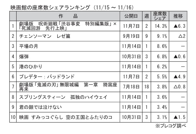株式会社サーティースリー:アカウントエグゼクティブ プレコグ調べによる、週末2日間(11月15~16日)の「映画館の座席数シェア」が表の通りまとまった。このランキングは、土日2日間に上映された「延べ座席数」(延べ上映回数×上映スクリーンの座席数)における、各作品のシェアを算出したもの。