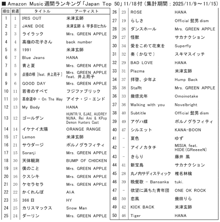 株式会社サーティースリー:アカウントエグゼクティブ Amazon Musicは18日、Amazon Musicで最も再生された楽曲を週間ランキング形式でまとめたプレイリスト「Japan Top 50」の最新ランキング(集計期間:11月9~15日)を公開した。