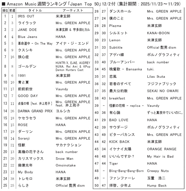 Amazon Musicは2日、Amazon Musicで最も再生された楽曲を週間ランキング形式でまとめたプレイリスト「Japan Top 50」の最新ランキング(集計期間:11月23~29日)を公開。米津玄師の「IRIS OUT」が11週連続で1位を獲得した。