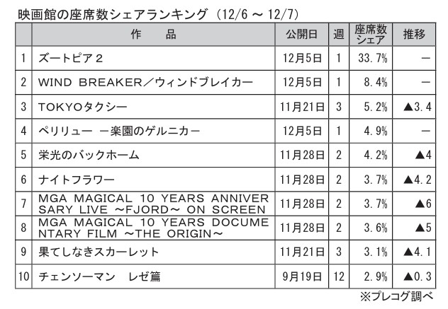 プレコグ調べによる、週末2日間(12月6~7日)の「映画館の座席数シェア」が表の通りまとまった。このランキングは、土日2日間に上映された「延べ座席数」(延べ上映回数×上映スクリーンの座席数)における、各作品のシェアを算出したもの。