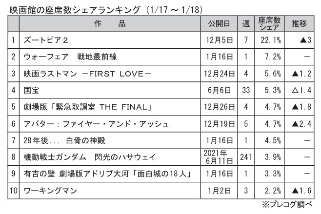 【注目!!】アイマックスジャパン株式会社:Associate Manager, Local Language Marketing プレコグ調べによる、週末2日間(1月17~18日)の「映画館の座席数シェア」が表の通りまとまった。このランキングは、土日2日間に上映された「延べ座席数」(延べ上映回数×上映スクリーンの座席数)における、各作品のシェアを算出したもの。
