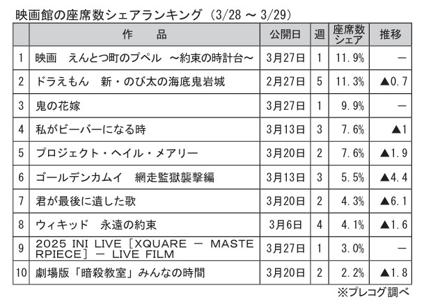 5週目『ドラえもん』は、0・7ポイント減の11・3%(2位)。1回あたりの座席数282・6は、今週の最高値。2週目の作品は、『プロジェクト・ヘイル・メアリー』が1・9ポイント減の7・6%(5位)、『暗殺教室』が1・8ポイント減の2・2%(10位)。ランキング詳細などは、Webサービス「文化通信.Pro」にもアップ。