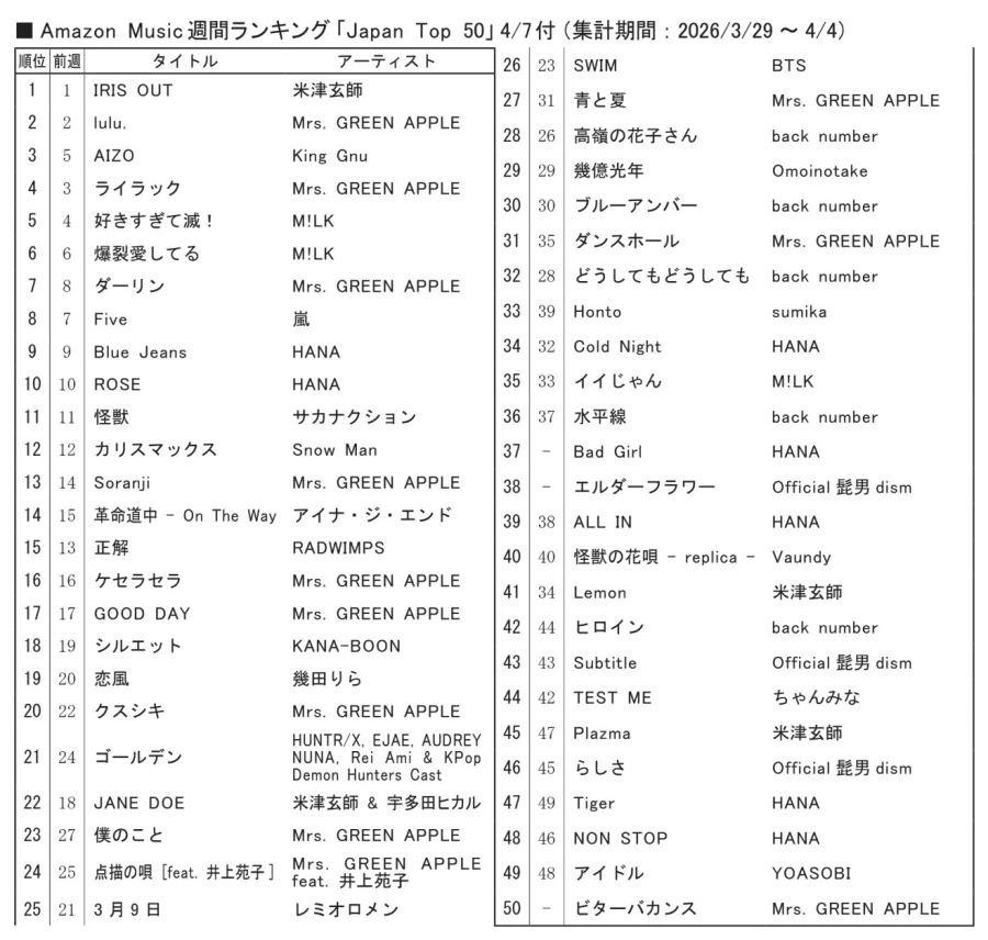 【注目!!】株式会社blueprint:総合カルチャーサイト「リアルサウンド映画部」の編集・企画(編集幹部候補) Amazon Musicは7日、Amazon Musicで最も再生された楽曲を週間ランキング形式でまとめたプレイリスト「Japan Top 50」の最新ランキング(集計期間:3月29日~4月4日)を公開。今週のランキングでは米津玄師「IRIS OUT」が7週連続で1位を獲得した。