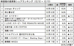 公開初週の新作は合計38・9%に達し、比較的動きの大きな週となった。新作2本『orange オレンジ』『母と暮せば』はともに約15%となり、上位を分け合った。『orange』の1館あたりの平均上映回数5・5回、上映1回あたりの平均座席数304・8回は、『母と暮せば』の5・2回、281・1席をいずれも上回った。