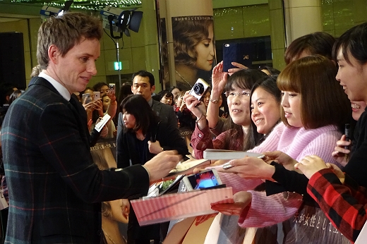 2人の来日は『レ・ミゼラブル』のプロモーション以来。またエディが日本のファンと直接交流するのは今回が初めて。当日の熱狂ぶりはわずか7分でチケットが完売するほど。2人がレッドカーペットに登場すると、「トム!」「エディ!」とサインや写真を求めた。2人は約40分間にわた り丁寧に応じた後、舞台挨拶の会場に移った。劇場に入るや940人を超える大きな拍手と歓声に迎えられた。