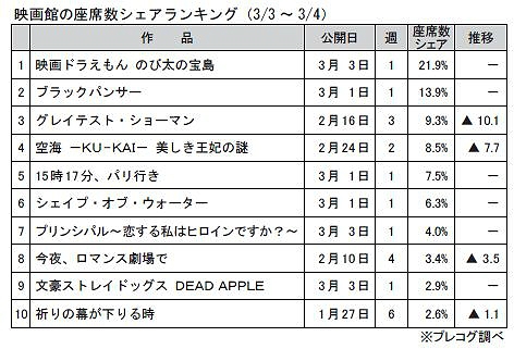 株式会社ガイエ:①パブリシスト(オンライン/オフライン:テレビ・紙パブリシスト募集!)②SNSプランナー③宣伝プロデューサー プレコグ調べによる、週末2日間(3月3~4日)の「映画館の座席数シェア」が表の通りまとまった。このランキングは、土日2日間に上映された「延べ座席数」(延べ上映回数×上映スクリーンの座席数)における、各作品のシェアを算出したもの。