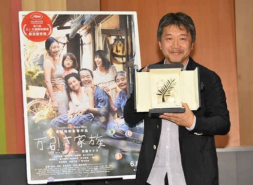 多くのフラッシュを浴びながら、トロフィーを抱えて登場した是枝監督は、「(受賞の)実感が湧いてきた。来月の公開に向けて、宣伝活動を始めなければならないので、気合を入れないとなと思っている」と話し、その後質疑応答を受け付けた。『誰も知らない』の主演男優賞、『そして父になる』の審査員賞受賞時との違いを問われると、「『誰も知らない』の時は子供たちの世話で手一杯だった。(今回)公式上映後に受けた取材では、記者たちから『Touch』と『Love』という言葉が一番多かった。それで、届いたなと良い手応えは感じた」と語り、注目を浴びている子役の城桧吏については「普段は実年齢より子供っぽいのに、レンズを通すと色っぽい」と魅力を説明した。「映画の中で注目してほしいポイントは?」と聞かれると「役者のアンサンブルがとてもうまくいった。自分なりの子供への演出と、演出も担える樹木(希林)さんとリリー(・フランキー)さん、安藤(サクラ)さん、松岡(茉優)さんも相手の演技を受けるのが上手でバランスがよかった」と俳優陣の演技を見どころに挙げた。