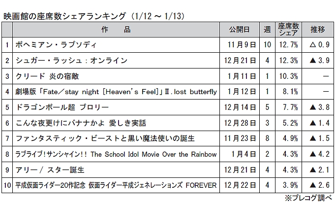 公開初週の新作は、『クリード 炎の宿敵』 が3位(10・3%)、『劇場版「Fate/stay night[Heaven's Feel]」II. lost butterfly』が4位(8・1%)。『Fate~』は1館あたりの平均上映回数が5・8回、上映1回あたりの平均座席数が332・7席で、いずれも今週公開作品の最高値。
