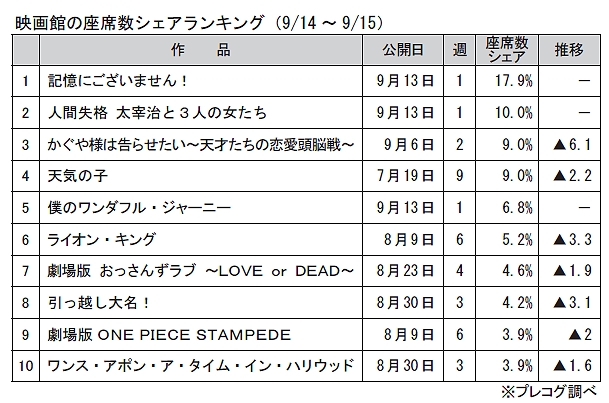 株式会社ガイエ:①パブリシスト(オンライン/オフライン:テレビ・紙パブリシスト募集!)②SNSプランナー③宣伝プロデューサー プレコグ調べによる、週末2日間(9月14~15日)の「映画館の座席数シェア」が表の通りまとまった。このランキングは、土日2日間に上映された「延べ座席数」(延べ上映回数×上映スクリーンの座席数)における、各作品のシェアを算出したもの。