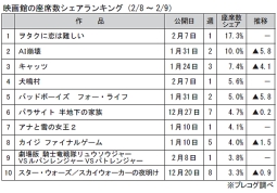 株式会社ガイエ:①パブリシスト(オンライン/オフライン:テレビ・紙パブリシスト募集!)②SNSプランナー③宣伝プロデューサー プレコグ調べによる、週末2日間(2月8~9日)の「映画館の座席数シェア」が表の通りまとまった。このランキングは、土日2日間に上映された「延べ座席数」(延べ上映回数×上映スクリーンの座席数)における、各作品のシェアを算出したもの。