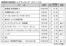 株式会社ガイエ:①パブリシスト(オンライン/オフライン:テレビ・紙パブリシスト募集!)②SNSプランナー③宣伝プロデューサー プレコグ調べによる、週末2日間(2月5~6日)の「映画館の座席数シェア」がまとまった。このランキングは、土日2日間に上映された「延べ座席数」(延べ上映回数×上映スクリーンの座席数)における、各作品のシェアを算出したもの。