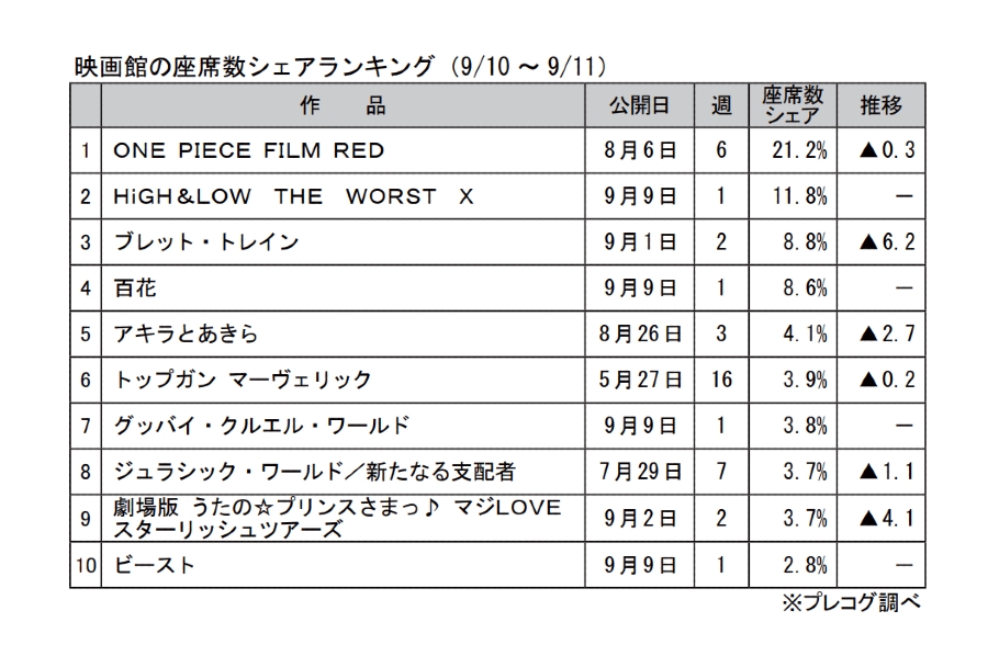株式会社ガイエ:①パブリシスト(オンライン/オフライン:テレビ・紙パブリシスト募集!)②SNSプランナー③宣伝プロデューサー プレコグ調べによる、週末2日間(9月10~11日)の「映画館の座席数シェア」が表の通りまとまった。このランキングは、土日2日間に上映された「延べ座席数」(延べ上映回数×上映スクリーンの座席数)における、各作品のシェアを算出したもの。