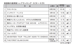 株式会社ガイエ:①パブリシスト(オンライン/オフライン:テレビ・紙パブリシスト募集!)②SNSプランナー③宣伝プロデューサー プレコグ調べによる、週末2日間(8月24~25日)の「映画館の座席数シェア」が表の通りまとまった。このランキングは、土日2日間に上映された「延べ座席数」(延べ上映回数×上映スクリーンの座席数)における、各作品のシェアを算出したもの。