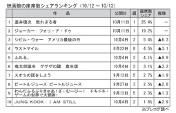 株式会社ガイエ:①パブリシスト(オンライン/オフライン:テレビ・紙パブリシスト募集!)②SNSプランナー③宣伝プロデューサー プレコグ調べによる、週末2日間(10月12~13日)の「映画館の座席数シェア」が表の通りまとまった。このランキングは、土日2日間に上映された「延べ座席数」(延べ上映回数×上映スクリーンの座席数)における、各作品のシェアを算出したもの。
