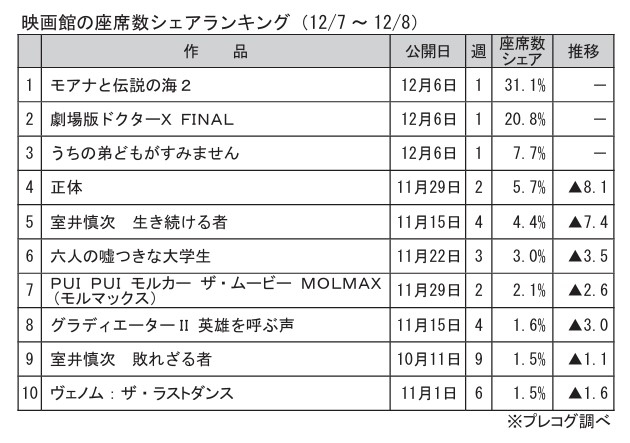 株式会社ガイエ:①パブリシスト(オンライン/オフライン:テレビ・紙パブリシスト募集!)②SNSプランナー③宣伝プロデューサー プレコグ調べによる、週末2日間(12月7~8日)の「映画館の座席数シェア」が表の通りまとまった。このランキングは、土日2日間に上映された「延べ座席数」(延べ上映回数×上映スクリーンの座席数)における、各作品のシェアを算出したもの。