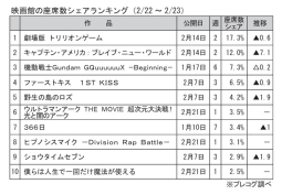 株式会社ガイエ:①パブリシスト(オンライン/オフライン:テレビ・紙パブリシスト募集!)②SNSプランナー③宣伝プロデューサー プレコグ調べによる、週末2日間(2月22~23日)の「映画館の座席数シェア」が表の通りまとまった。このランキングは、土日2日間に上映された「延べ座席数」(延べ上映回数×上映スクリーンの座席数)における、各作品のシェアを算出したもの。