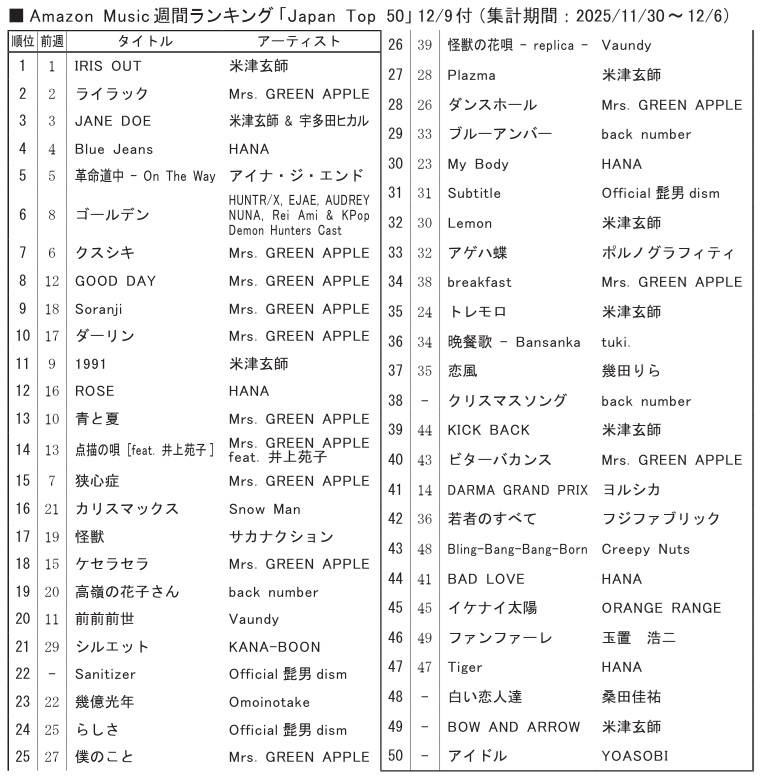 株式会社ガイエ:①パブリシスト(オンライン/オフライン:テレビ・紙パブリシスト募集!)②SNSプランナー③宣伝プロデューサー Amazon Musicは9日、Amazon Musicで最も再生された楽曲を週間ランキング形式でまとめたプレイリスト「Japan Top 50」の最新ランキング(集計期間:11月30日~12月6日)を公開。米津玄師の「IRIS OUT」が12週連続で1位を獲得した。