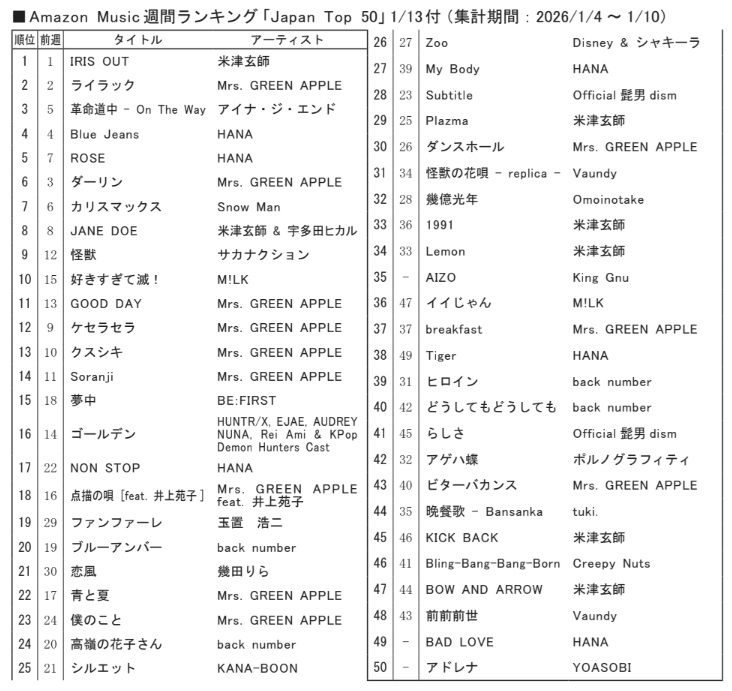 【注目!!】株式会社クロックワークス:制作アシスタント Amazon Musicは13日、Amazon Musicで最も再生された楽曲を週間ランキング形式でまとめたプレイリスト「Japan Top 50」の最新ランキング(集計期間:1月4~10日)を公開。今週のランキングでは、米津玄師の「IRIS OUT」が17週連続で1位を獲得した。