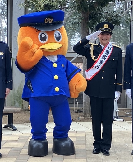 また、警察音楽隊の演奏で“サイバー防犯早口言葉”に参加したり、「上を向いて歩こう」をコラボ歌唱。一日警察署長としての活動に従事した。