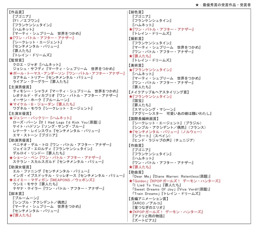 第98回アカデミー賞の授賞式が現地時間15日に行われ、『ワン・バトル・アフター・アナザー』が作品賞、監督賞、助演男優賞、脚色賞など最多6部門を制した。メイクアップ&ヘアスタイリング賞で候補入りしていた『国宝』は、受賞を逃した。受賞結果(一部)は表のとおり。