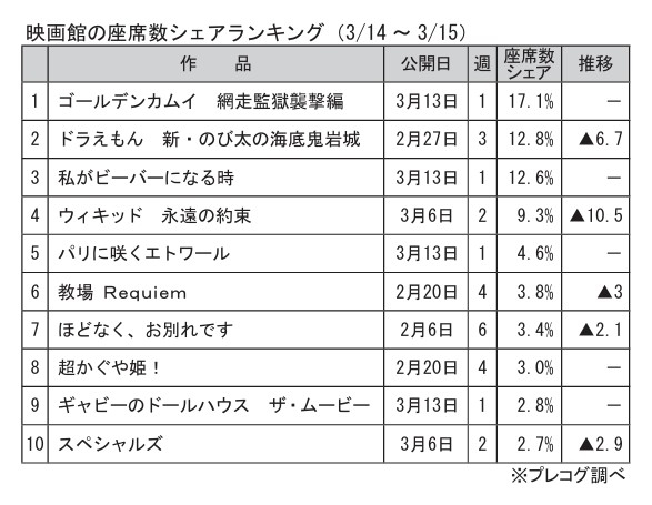 公開初週の新作がトップ10内に4本入り、合計シェアは37・1%。その1本『ゴールデンカムイ 網走監獄襲撃編』が首位(17・1%)。1館あたりの上映回数5・8は、今週の最高値。1回あたりの座席数は289・8。