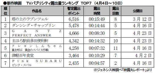 ジェネシス(旧マインドベース)調べによる、地上波テレビ(東京:6局)における映画作品の「パブリシティ露出量ランキング」(4/4~10)がまとまった。このランキングは各番組で紹介された映画の紹介時間を、放送局や時間帯を加味した独自「露出ポイント」(暫定)に換算、露出量を測定したもの。