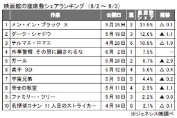 公開2週目「メン・イン・ブラック3」が30%超の高いシェアを維持し、2週連続で首位を飾った。1館あたりの平均上映回数は、前週(10・8回)から大きな変化はなく、10・2回の高水準に達した。初週作品でトップ20内に入ったのは「外事警察 その男に騙されるな」のみで、全体的に動きの少ない週となった。前週の上位作品の数値に殆ど変化はなく、2週目「ガール」が3ポイント減少したものの、6週目「テルマエ・ロマエ」は1・9ポイント増加した。