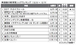 2週目『007 スカイフォール』が、首位(16・2%)をキープした。1館あたりの平均上映回数は7・0回で、今週も最高値となった。先週2位の4週目『ヱヴァンゲリヲン新劇場版:Q』は、8・8ポイント減と大きくポイントを落とし4位(7・8%)となったものの、1館あたりの平均上映回数は0・1ポイント減の6・1回と、先週とほぼ同値を維持した。