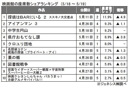 株式会社ガイエ:①パブリシスト(オンライン/オフライン:テレビ・紙パブリシスト募集!)②SNSプランナー③宣伝プロデューサー ジェネシス調べによる、週末2日間(5月18~19日)の「映画館の座席数シェア」がまとまった。このランキングは、土日2日間に上映された「延べ座席数」(延べ上映回数×上映スクリーンの座席数)における、各作品のシェアを算出したもの。