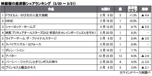 3週目を迎えた「ドラえもん のび太の人魚大海戦」が、3週連続で座席数シェア首位の座を維持した。公開初週の4作品が、座席数シェアのトップ10圏内にランクイン。「ドラえもん~」と僅差で2位となった「NINE」は、上映1回あたりの平均座席数は229・6席ながら、1館あたりの平均上映回数は5・2回に達している。公開初週の「映画 プリキュアオールスターズDX2」は、館数シェアではトップ10圏外(14位)となったものの、上映1回あたりの平均座席数が340・5席の高い水準に達し、上位に食い込んでいる。また、13週目の「アバター」の座席数シェアは2・6ポイント減少し、8位に後退した。なお、ランキングの詳細など問合せは、同社(staff@mindbase.co.jp)まで。