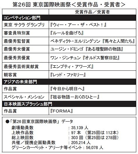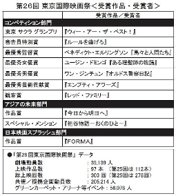 第26回東京国際映画祭が25日に閉幕した。当日はTOHOシネマズ六本木ヒルズで各賞の授賞式が行われ、コンペティション部門の東京サクラグランプリはスウェーデン映画『ウィー・アー・ザ・ベスト!』が受賞。今年のコンペ部門は、別表の通り7つのアワードを7作品が分け合う形となった。