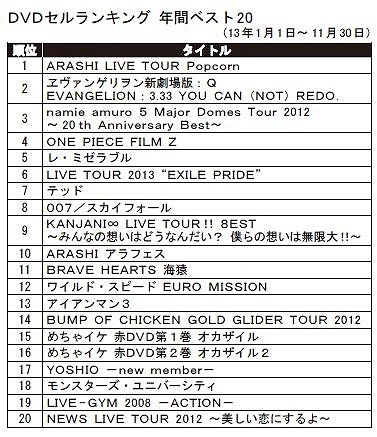 1位は嵐のライブ作品「ARASHI LIVE TOUR Popcorn」が獲得。嵐は3年連続で1位となった。以下、安室奈美恵、EXILE、関ジャニ∞などの音楽DVDもランクイン。映画では『ヱヴァンゲリヲン新劇場版:Q』『ONE PIECE FILM Z』『レ・ミゼラブル』などが上位に入った。