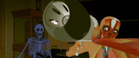 平田 これは竹清の話ですが、「モーション・キャプチャーで何か面白いことはできないか」と考えていたところ、動かないはずの人体模型がすごく滑らかにリアルな動きをすれば面白いのではないかと思ったのです。あと、実はコストの面もあります。例えば普通の人間のキャラクターなら髪の毛も洋服もCGで動かす必要がありますが、人体模型には髪の毛も洋服もありません。なので、それほどコストをかけずにできるのではないかと考え、トライしました。7分間の映像ですが企画から約1年半で完成しましたね。