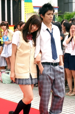 この日は制服姿でずらりそろい闊歩。25歳の山本、31歳の徳山もまだまだ男子高生役で大丈夫。お台場合衆国の来場者らから黄色い歓声があがった。西内は「この夏はこのドラマを見てキュンキュンして!」と呼びかけていた。