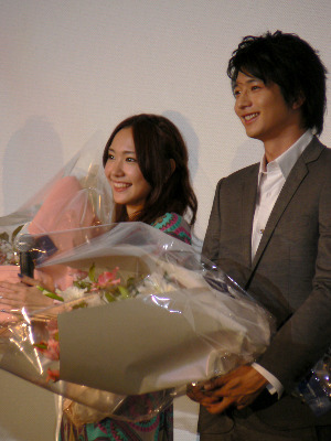 東宝配給「ハナミズキ」の初日舞台挨拶が21日、東京のTOHOシネマズ日劇2で行われ、主演の新垣結衣、生田斗真、向井理、土井裕泰監督が客席後方扉より客席の間を通って登壇すると大きな歓声が飛んだ。(右写真、左から新垣、向井)